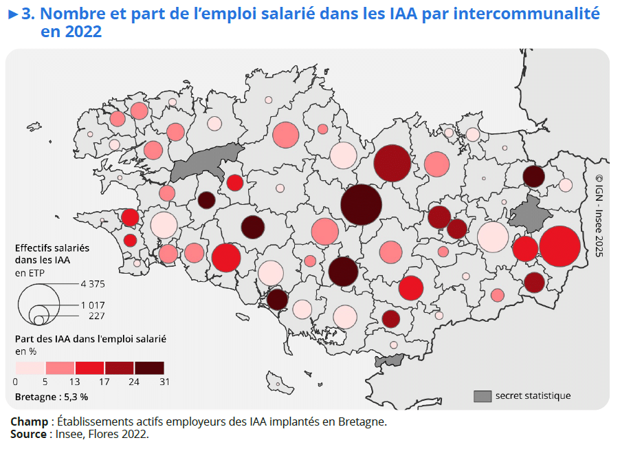 Carte issue de la publication « Les industries agroalimentaires en 2022 : un secteur majeur pour l’emploi industriel breton » – Insee Analyses Bretagne, n°136, Octobre 2025, Bertin S., Jolivet S.