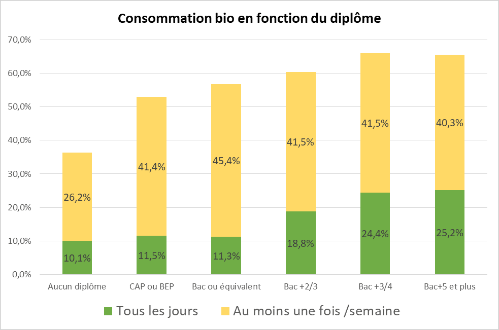 Plus que le revenu, le niveau de diplôme est le facteur le plus déterminant de la consommation bio, en particulier quotidienne. Mais les plus aisés y accordent une plus grande part de leurs achats. Un quart des consommateurs le sont depuis au moins dix ans, et ce sont ceux qui y accordent la plus grande part de leurs achats (+ de 40 %).