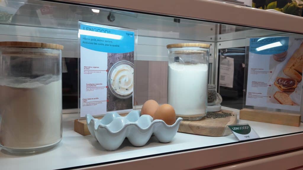 Ingood, la division ingrédient d’Olga (35), propose une poudre de lentilles vertes fermentées qui peut venir en substitution complète de l’œuf dans les recettes de pâtisseries et de sauces. L’entreprise met en avant la simplicité de sa recette face aux formulations plus complexes de ses concurrents.