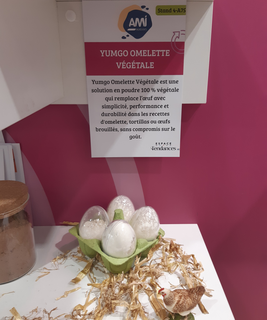 L’entreprise Yumgo (Seine-et-Marne) a par exemple fait de « L’œuf sans poule » sa marque de fabrique. À l’occasion du salon, elle met en avant une omelette végétale sous forme de poudre à base notamment de protéine de haricot et de farine de riz. Elle propose également une meringue végétale avec un foisonnement 1,6 fois supérieur à celui obtenu avec l’œuf, à base de protéine de pomme de terre et de pois.