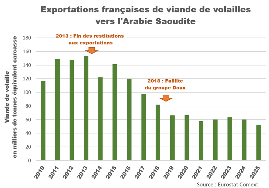 Pendant des décennies, l’activité des volaillers bretons Doux et Tilly Sabco était basée sur la production de poulets entiers congelés de calibre medium, à destination du Moyen-Orient, et de l’Arabie Saoudite en grande majorité. Le modèle économique reposait sur les restitutions aux exportations, aides européennes compensant l’écart avec les prix mondiaux. Lorsqu’en 2013 l’UE met fin à ces restitutions (auxquelles on reprochait de fausser la concurrence), c’est le début d’un lent déclin. Jusqu’à la liquidation judiciaire de Tilly Sabco et du groupe Doux en 2018.