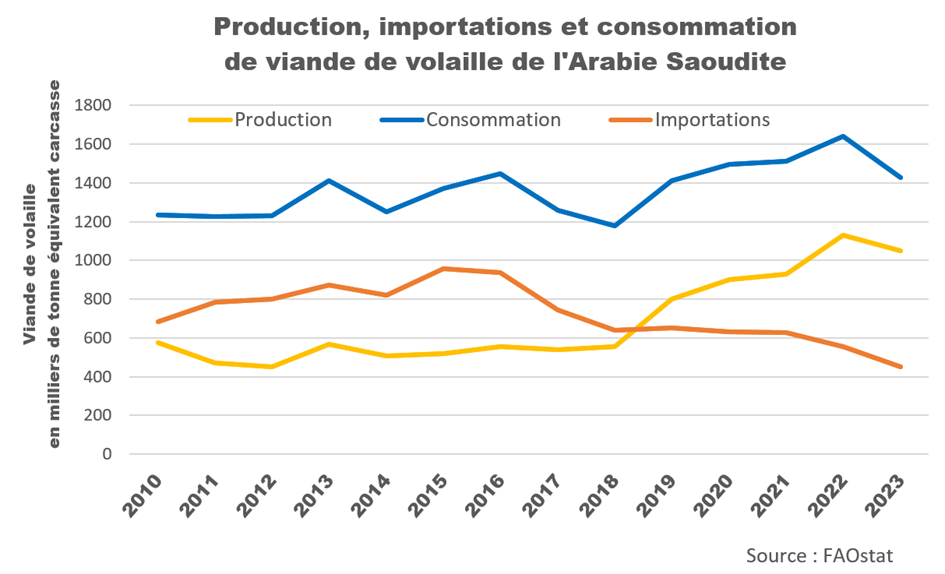 Mais ces restructurations ne changent pas la donne. Non seulement la volaille française n’est pas compétitive face à l’offre brésilienne ou ukrainienne, mais aussi l’Arabie Saoudite a considérablement augmenté sa propre production de poulet (cf. graphique ci-après). Alors que le grand export représentait à son apogée le débouché de près du tiers de la production bretonne, il pèse aujourd’hui moins de 20 % (12 % pour l’Arabie Saoudite). France Poultry qui abattait plus de 300 000 volailles par jour il y a quelques années, n’en abat en 2025 que 210 000 par jour.