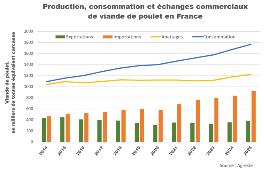 Pour autant, on peut penser que la part de la production nationale dans la consommation peut progresser. En 2024, 62 milliers de tonnes de volaille, en grande majorité du poulet France Poultry, étaient expédiées de Bretagne vers le Moyen-Orient. Réorientés vers le marché français (mais diminués de 10 %), ces volumes pourraient en théorie se substituer à une partie des importations. Mais rien n’est moins sûr : le rythme annuel de hausse de consommation de poulet est en fait supérieur à ces volumes (+ 92 milliers de tonnes en 2025).